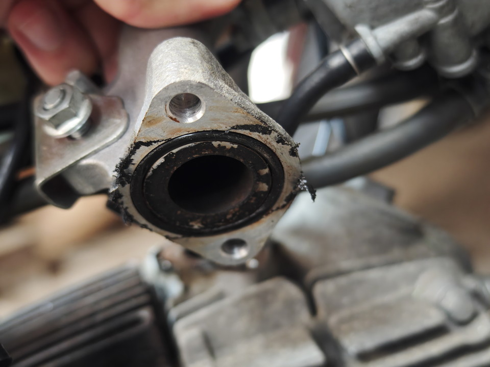 時間のある時に原因探しをしよう……と思っていたが、レッグシールドを剥がしてみたら明らかにインマニのOリングが死んでいるので、DIYで交換してみた。