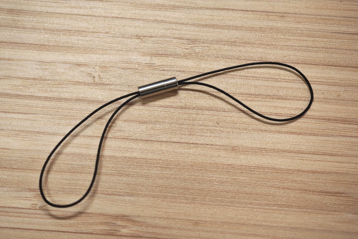 付属のストラップはあまり頑丈ではなく、中央がネジ式で外れやすいので注意。